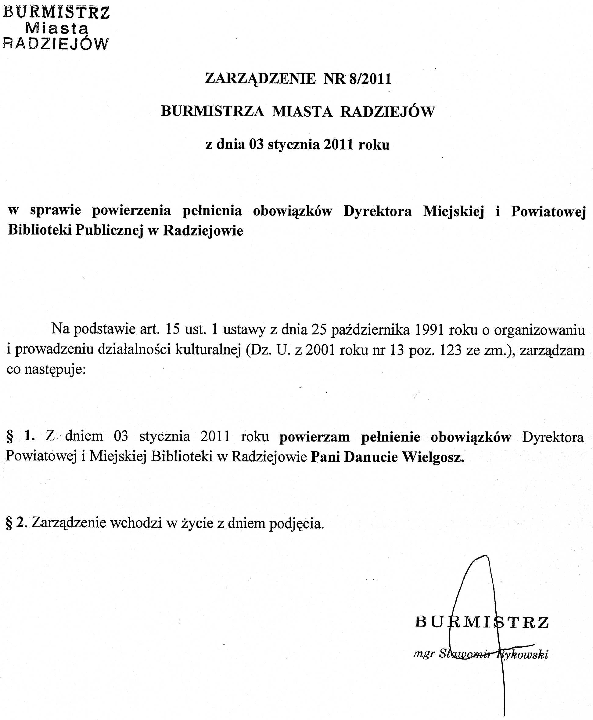 Zarz膮dzenie Burmistrza Miasta Radziejowa z dn.03.01.2011 r. ws powierzenia pe艂nienia obowi膮zk贸w Dyre