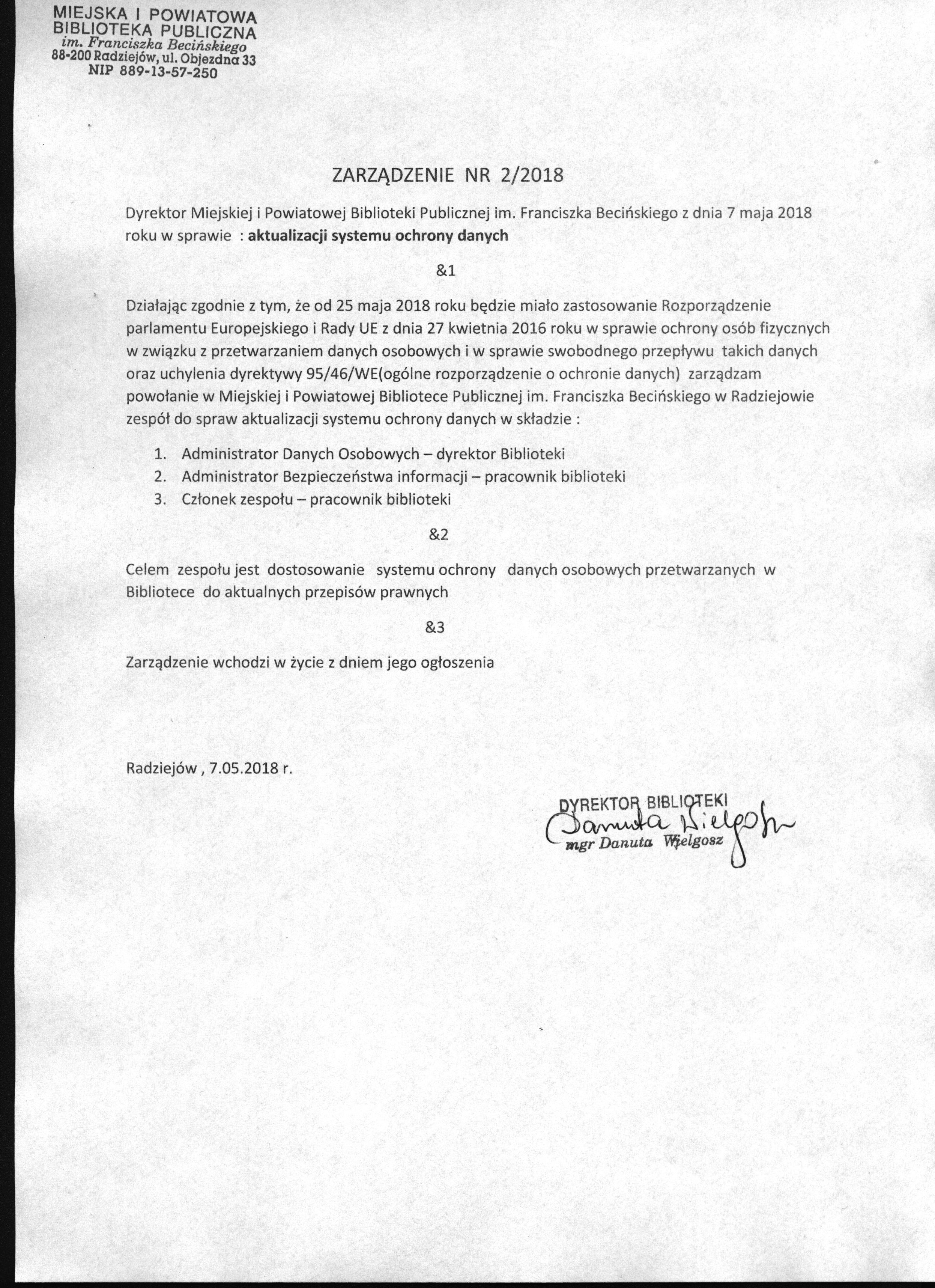 Dyrektor Miejskiej i Powiatowej Biblioteki Publicznej im. Franciszka Beci艅skiego z dnia 7 maja 2018 roku w sprawie : aktualizacji systemu ochrony danych.